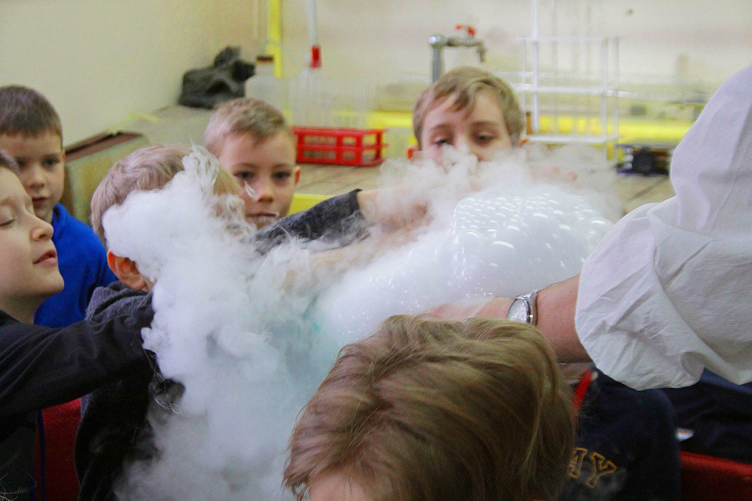 Spotkacie Koło Naukowe Foton, na ich stanowisku będzie można tworzyć chmury, przestrzenne figury z dobrze znanych mydlanych baniek, poznać zjawisko refrakcji, a przy okazji sprawić, że szklany element zwyczajnie zniknie. Będą też eksperymenty wykorzystujące zjawisko napięcia powierzchniowego oraz eksperymenty bardzo klasyczne, ale pouczające jak nurkowanie z Kartezjuszem.