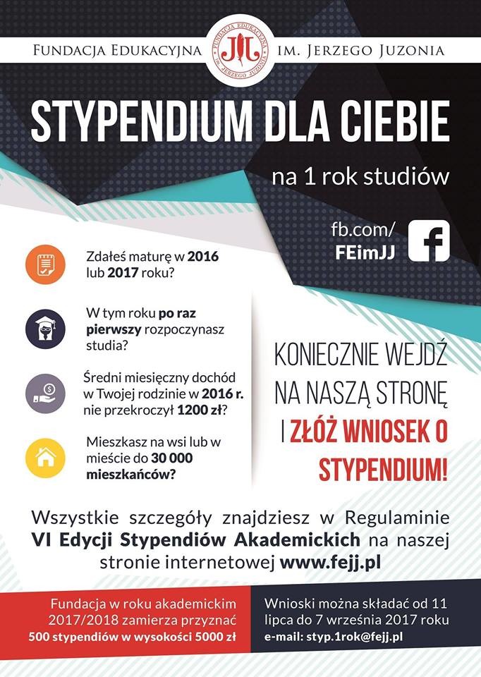 Fundacja Edukacyjna im. Jerzego Juzonia jeszcze przez dwa tygodnie (do 7 września br.) prowadzi nabór do VI edycji stypendiów akademickich FEJJ przeznaczonych dla przyszłych studentów. W roku akademickim 2017/2018 zostanie przyznanych 500 stypendiów (po 5 000 zł każde) dla studentów na pierwszym roku studiów (podjętych pierwszy raz, w trybie jednolitym lub dwustopniowym na uczelni, która prowadzi nabór na studia II stopnia, stacjonarne, na wybranym przez kandydata kierunku).