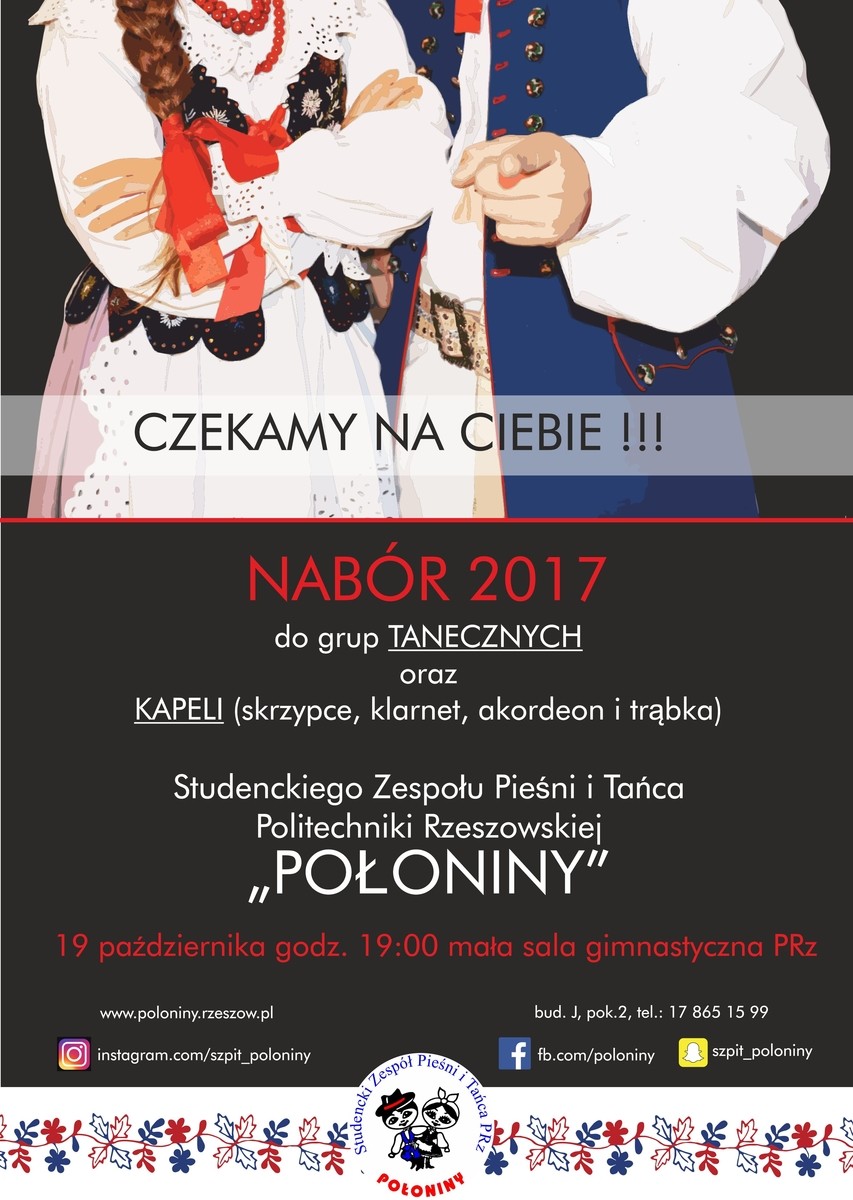 Chcesz być częścią blisko 50-cio letniej tradycji oraz historii Studenckiego Zespołu Pieśni i Tańca Politechniki Rzeszowskiej „POŁONINY”? Dołącz do pasjonatów tańca i muzyki ludowej. Zapraszamy na spotkanie organizacyjne 19 października br., które odbędzie się na małej sali gimnastycznej PRz. Nabór prowadzony jest do grup tanecznych i kapeli (skrzypce, klarnet, akordeon i trąbka).