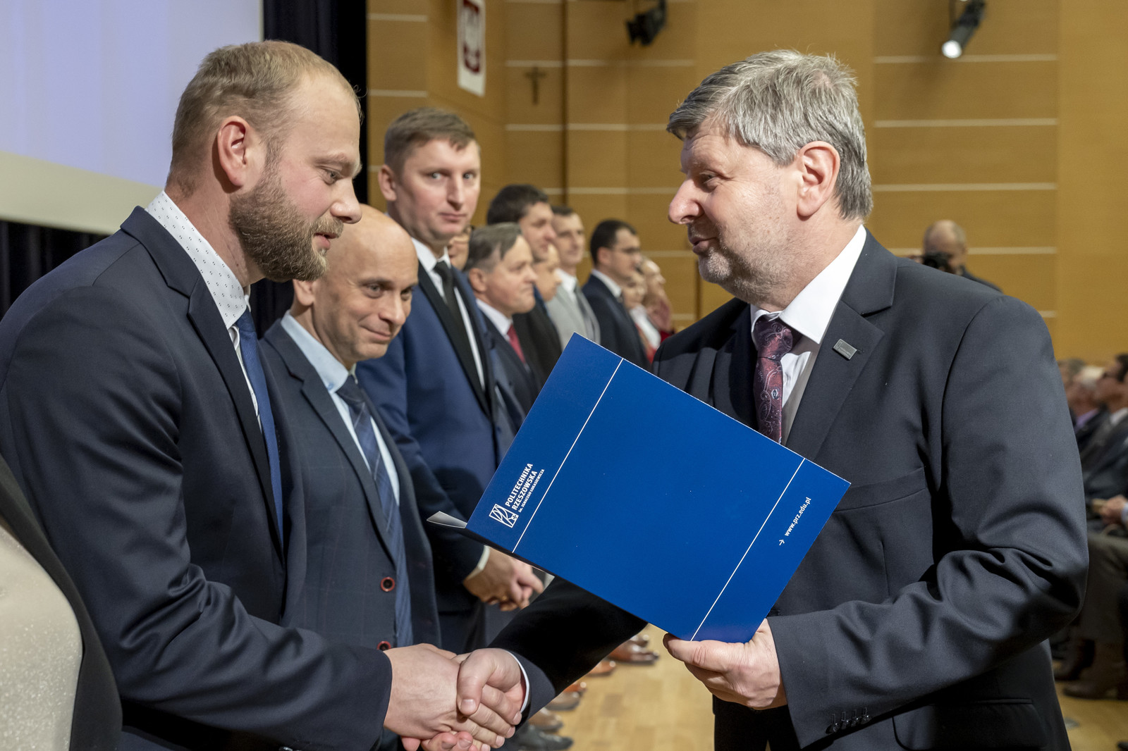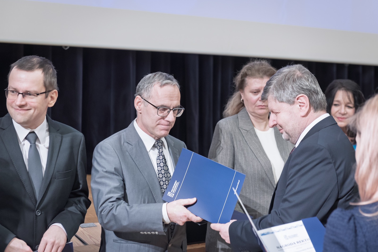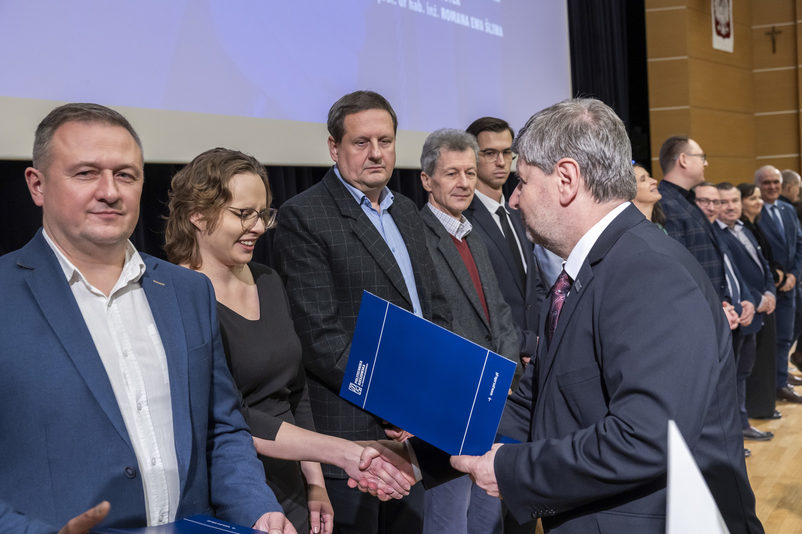 Uroczystość poprowadził prorektor ds. nauki dr hab. inż. Lesław Gniewek, prof. PRz. Dyplomy nagród wręczył rektor prof. dr hab. inż. Piotr Koszelnik. w towarzystwie dziekanów.