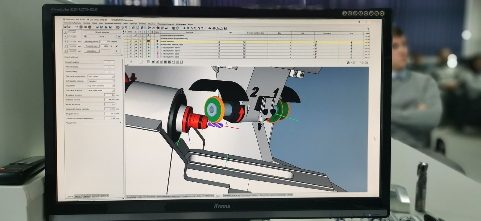 W ramach szkolenia przedstawiono z wykorzystaniem oprogramowania Helitronic Tool Studio zaawansowane funkcje wspierające projektowanie i optymalizację narzędzi skrawających, w tym: wizualizację 3D narzędzi skrawających – umożliwiającą dokładną analizę geometrii narzędzi w trójwymiarowej przestrzeni, weryfikację obróbki z użyciem cyfrowego bliźniaka – symulację procesów obróbczych w wirtualnym środowisku, co pozwala na wcześniejsze wychwycenie ewentualnych błędów i optymalizację, detekcję ruchów kolizyjnych i podcięć szlifierskich – narzędzia umożliwiające identyfikację potencjalnych problemów w procesie, co zapewnia optymalizację ścieżek szlifowania i eliminację błędów, moduł budowy pakietów ściernic – umożliwiający precyzyjne modelowanie i konfiguracje ściernic w procesie szlifowania, moduł do tworzenia dokumentacji rysunkowej – automatyczne generowanie pełnej dokumentacji technicznej, zgodnej z wymaganiami norm i standardów branżowych.