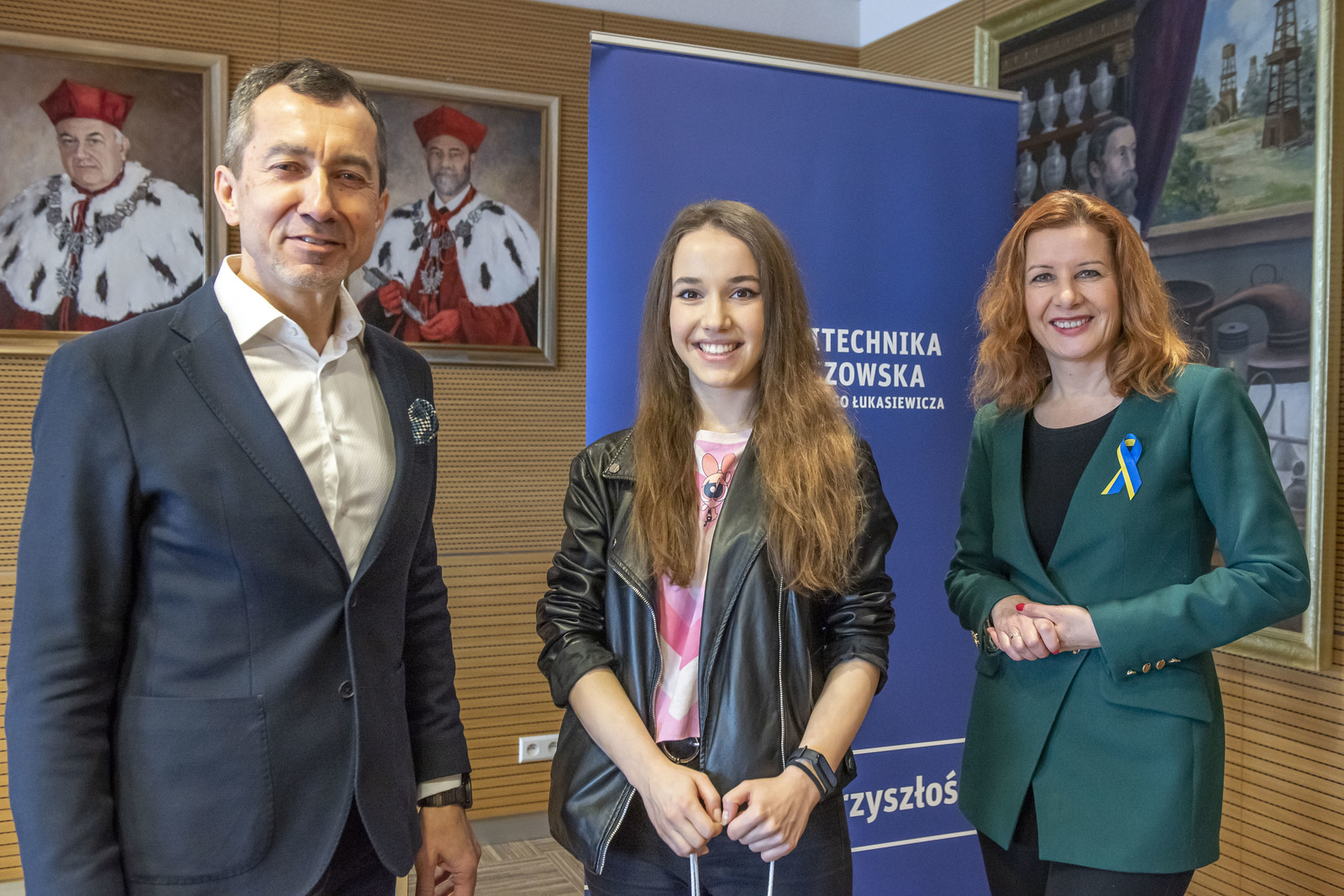 Studenci z Koła Naukowego Finansów i Zarządzania z prorektorem ds. studenckich prof. G. Ostaszem (pierwszy od lewej), dziekanem WZ prof. PRz B. Zatwarnicką-Madurą (pośrodku) i opiekunem koła dr. inż. M. Sołtysiakiem (pierwszy od prawej),